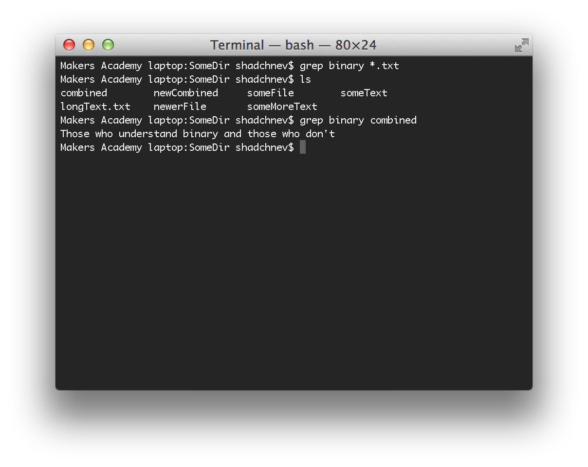 The "grep" command takes two parameters: the first is what you want to search for (in this case, the word "binary") and the second is what files you want to search through (in this case, the file "combined").