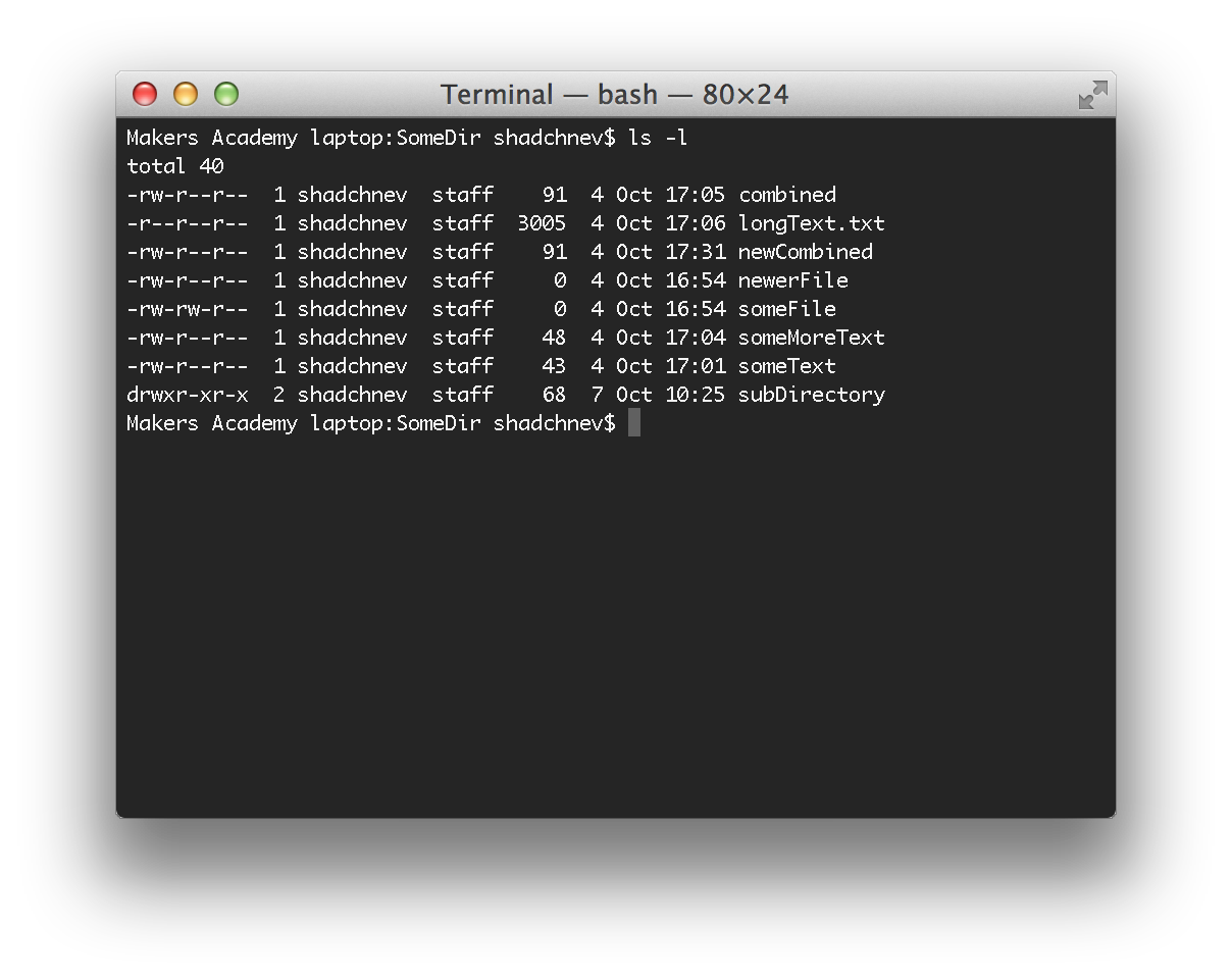 Then come three groups of three characters: "r", "w", "x" or "-". The first group determines the permissions of the "user" class. For example, in case of "subDirectory" in the screenshot above, its permissions ("drwxr-xr-x") mean that the owner of the file (in this case "shadchnev") has read, write and execute permissions ("drwxr-xr-x").